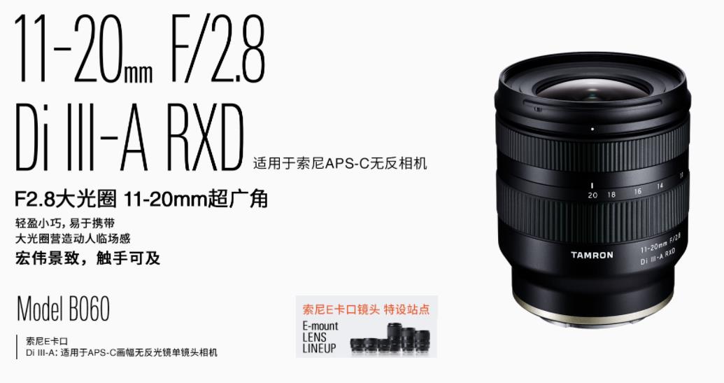 11-20mm F/2.8 Di III-A*1 RXD(型號 B060)擁有全焦段F2.8大光圈,同時具備出色的便攜性,是一支適用于索尼E卡口APS-C畫幅無反相機的大光圈超廣角變焦鏡頭。大光圈有助于在昏暗拍攝場景中提高快門速度,防止抖動,以便獲得畫面銳利的照片。特殊材質鏡片經優化配置,良好矯正各種像差,帶來清晰畫質與高解析性能。憑借令人驚嘆的輕便與緊湊,日常使用不在話下,在希望減輕行李負擔的路途中也是不錯的選擇。廣角端0.15m、望遠端0.24m的最近拍攝距離,可充分靠近被攝體。AF驅動系統中搭載高速精確的步進馬達單元RXD(高速靜音步進驅動)。簡易防滴構造和抗污涂層,使戶外拍攝更安心。目之所及即有成為作品的可能,這支鏡頭可輕松拍出大光圈固有特色,助您拓展拍攝樂趣。