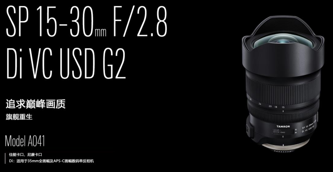 大光圈超廣角變焦鏡頭SP 15-30mm F/2.8 Di VC USD G2(型號A041)擁有高畫質,可將眼前景色一網打盡。特殊玻璃與非球面鏡片的優化配置,大幅抑制廣角端較易產生的畸變及放大色差。為該鏡頭特別開發的全新AX(Anti-reflection eXpand)抗反射鍍膜,配合eBAND及BBAR鍍膜,實現了從中心到邊緣的清晰畫面表現。另外,鏡頭配備有高精度的先進自動對焦技術與強勁的VC光學防抖。佳能EF卡口標配有后置濾片安裝裝置,可方便地進行濾鏡創作。耐磨損性大幅提升的高耐久抗污涂層加上簡易防滴構造,為各種拍攝環境提供更多防護支持。